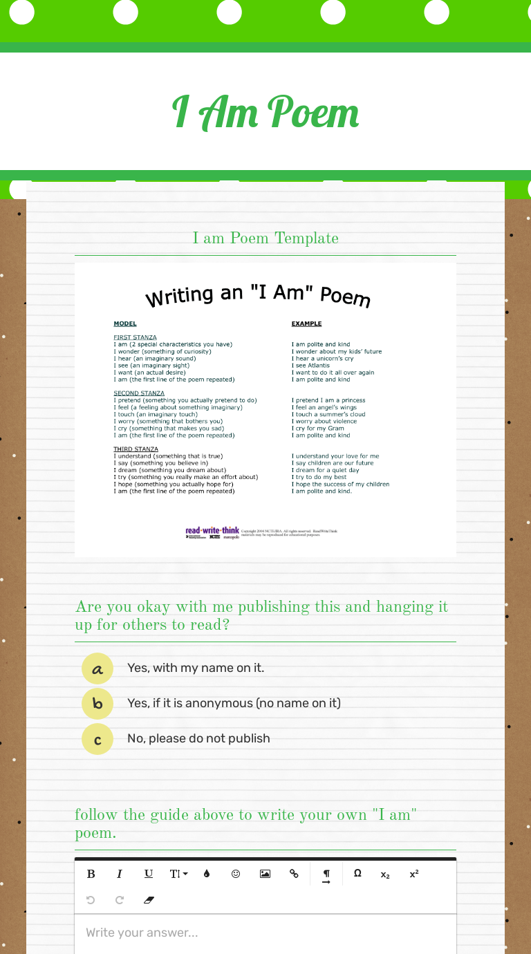 I am poem worksheet. © Freeology.com I Am Poem I am _____ (Two special characteristics) I wonder _____ (Something you are curious about) Teaching Poetry. Writing Poetry. Beginning Of School. I Am Poem Template (Features 9 Bright Colored Borders) ";I Am Poem" template used for upper elementary and beyond! Students can do rough draft on black and white copy and then choose a colored copy for the final. Enjoy Comes in: purple, seafoam, pink, dark blue, sky blue, lime green & orange ... name) to write poems about who they are—their identities. 2. First, have students think about different aspects of their identity by discussing and completing the Who Am I? Worksheet. 3. Distribute the Who Am I? Worksheet to each student and go over each section, explaining what each of the sections means, asking for and giving an example for ... Basically, a formulaic “I Am” poem is a poem that is basically already written for you. All you have to do is fill in the blanks with your own specific answers. Free Verse Here, the writer takes the basic idea of the “I Am” poem and runs with it. The writer creates their own idea of the “I Am” poem while expressing their personal