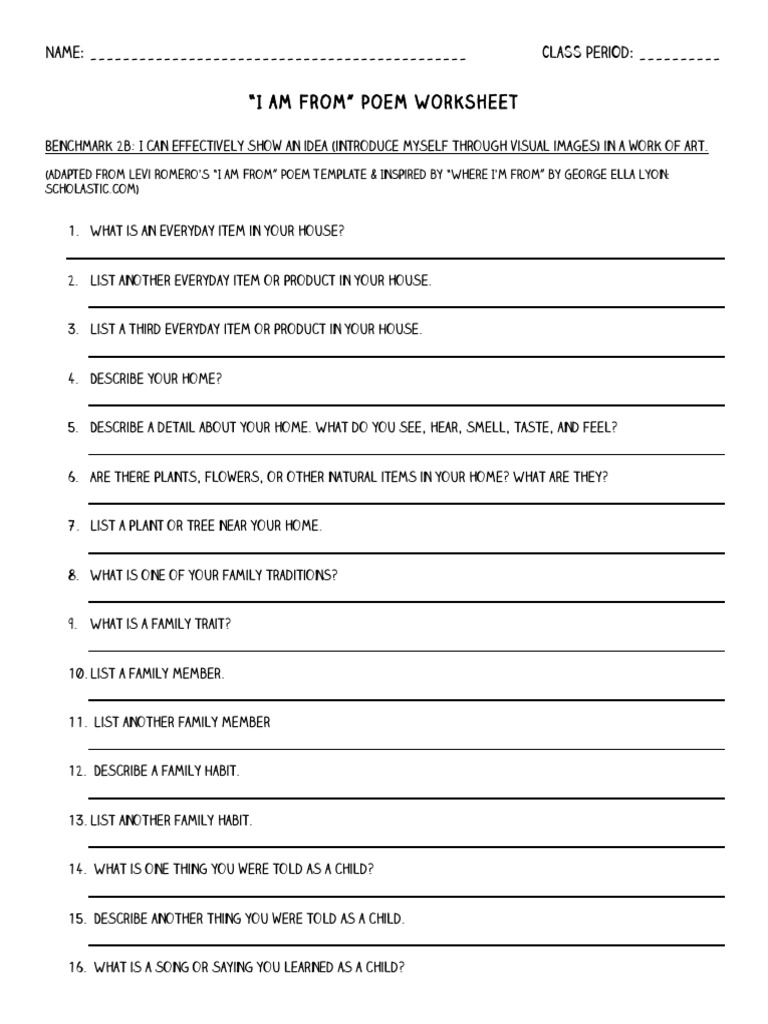 I Am Poem Worksheet. Our systems accept detected abnormal cartage action from your network. Please complete this reCAPTCHA to authenticate that it’s you authoritative the requests and not a robot. If you are accepting agitation seeing or commutual this challenge, this folio may help. If you abide to acquaintance issues, you can acquaintance JSTOR support. Block Reference: #ae4b5690-fbfe-11eb ... The “I AM” Poem is a creative writing assignment that serves three important purposes: (1) It introduces you to some of the basic features of poetry. (2) It gives you the opportunity to tell others about yourself in a creative way. (3) It challenges you to think critically & write skillfully after a long summer away from school. Copies of the '';I Am'' poem worksheet Relaxing music (optional) Instructions Project a segment of Shel Silverstein's ''Where the Sidewalk Ends'' on the screen. Read through this poem as a class,... • Give students the brainstorming worksheet (available at the end of this guide) and about 5 minutes to brainstorm, then give them another 5-10 minutes to write their poems. • The topics below are found on the brainstorming worksheet, with an added example of how this activity could be adapted for discipline-specific reflection.