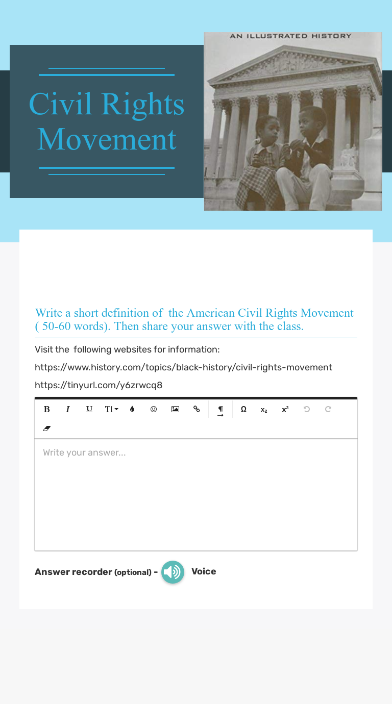 Civil Rights | iCivics The Civil Rights unit covers the early days of the expansion of slavery in the United States through the momentous 1950s and 60s and into the modern Civil Rights Movement. Use primary documents, readings, activities and more to introduce your students to key concepts, events, and individuals of this facet of American history.