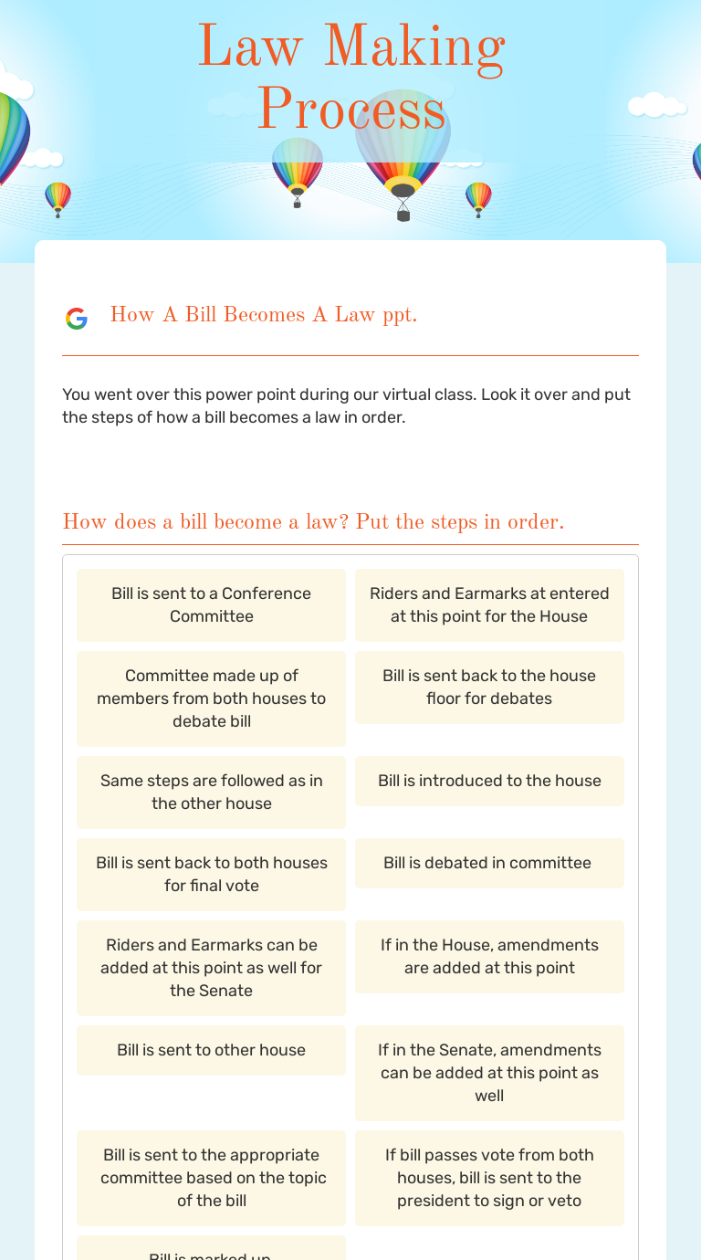 how a bill becomes a law worksheet flashcards and study... | Quizlet How a Bill Becomes a Law. Who introduces a bill? Does a Bill have to pass through both h… 157 terms. rose2161. How a bill becomes a law. Who can propose a bill? How long is a congressional term.
