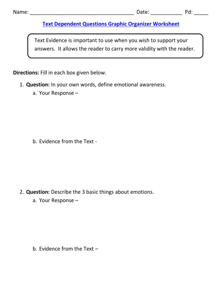 Text Dependent Questions Graphic Organizer Worksheet Text Dependent Questions for Understanding Emotions Article. Report this Document. Description: Text Dependent Questions for Understanding Emotions Article. Copyright: © All Rights Reserved.