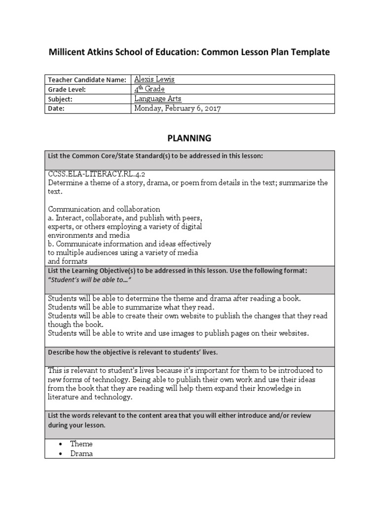 (PDF) 4th grade Gifted Students Technology lesson Project Plan The common themes on using technology in the curriculum included differentiating to. 4th Grade. Technology Lesson Plan. 8 Weeks. Stage 1 Students in grades 4 read online information about Tigers and. Leopard, and Dog and Wolf, write down the similarities and differences to the Microsoft... Browse 4th Grade Lesson Plans | Education.com Browse 4th Grade Lesson Plans. Award winning educational materials designed to help kids Figuring Out the Theme. Most stories have a message for the reader! Help students determine a Use this lesson plan to help your students get to know this prominent scientist, and determine what...