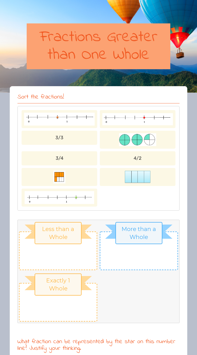 Lesson Worksheet:Fractions Greater Than One | Nagwa Lesson Worksheet: Fractions Greater Than One. In this worksheet, we will practice using models to explain how an improper fraction can be decomposed into a number of wholes and remaining parts and writing improper fractions as mixed numbers. Nine-quarters 9 4 is an improper fraction that can be represented by a whole number and a fraction. Represent a Fraction greater Than One on a Number Line ... Represent a Fraction greater Than One on a Number Line. Represent a Fraction greater Than One on a Number Line 1. ID: 2809652. Language: English. School subject: Math. Grade/level: 3. Age: 8-10. Main content: Worksheets. Other contents: Activity.