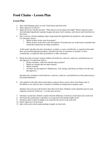 Food Chain/Web Lessons, Worksheets and Activities Teaching Your Young Students About the Food Chain. Teacher Planet offers lesson plans for teaching about the food chain and the food web. Resources include hands on activity plans, worksheets, clip art, printables and additional teaching resources to help you plan and organize your food chain unit.