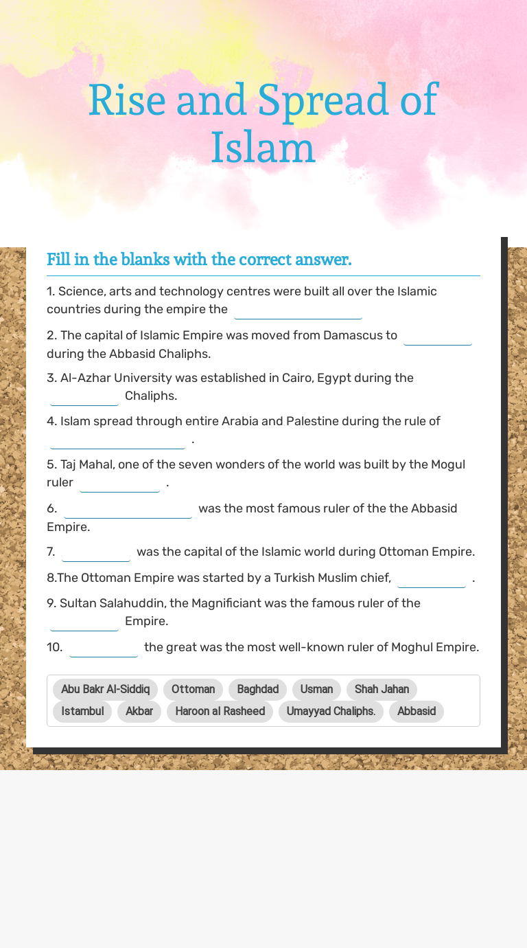 Rise of Islam worksheet - Liveworksheets.com ID: 1659345 Language: English School subject: World History Grade/level: ESE High School Age: 13+ Main content: Comprehension Other contents: Fill in Add to my workbooks (2) Download file pdf Embed in my website or blog Add to Google Classroom