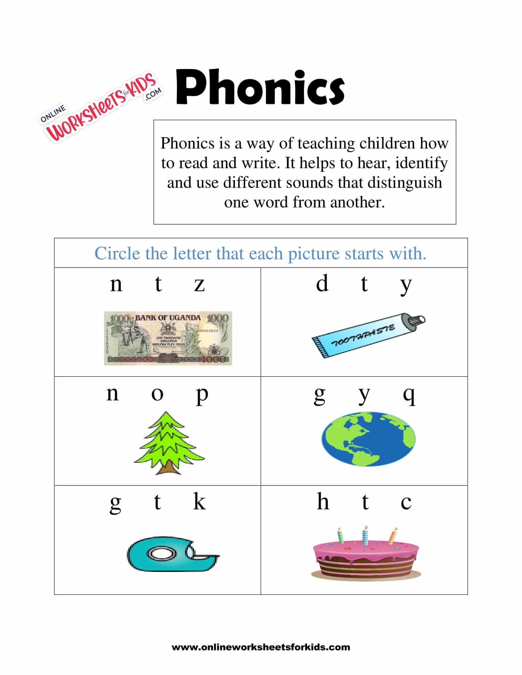 Free Preschool & Kindergarten Phonics Worksheets... | K5 Learning Sounds and phonics worksheets for preschool and kindergarten, including beginning sounds, consonants, vowels and rhyming. Free phonics worksheets. Phonics is a method of teaching kids to learn to read by helping them to match the sounds of letters, and groups of letters, to distinguish... Phonics Worksheets On the printable phonics worksheets below, students must circle the word from a list which best describes the picture. Want to use a study tool which automatically scores your work and allows you to review your mistakes? Have fun and help preserve the environment at the same time.