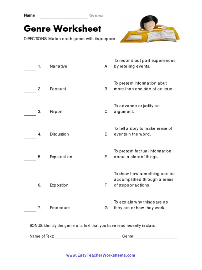 Genre Worksheet Teaching Resources | Teachers Pay Teachers This unit will help teach and practice reading genres. Included is a genre chart, definitions, and 8 different practice worksheets. The practice worksheets include examples of different genres for students to identify. Also included are answer keys and a longer worksheet that can be used with all the other 8 practice sheets.