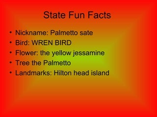 Fun facts about south carolina. South Carolina | Capital, Map, Population, History, & Facts | Britannica South Carolina, constituent state of the United States of America, one of the 13 original colonies. It lies on the southern Eastern Seaboard of the United States. Shaped like an inverted triangle with an east-west base of 285 miles (459 km) and a north-south extent of about 225 miles (360 km), the state is... Interesting Facts About South Carolina South Carolina has a number of reputed universities some of which are University of South Carolina, Clemson University, College of Charleston, Anderson University, Furman University, Winthrop University, and Converse College. Interesting Facts About South Carolina. 25 Fascinating Facts About South Carolina | Mental Floss Before your next visit, file away these 25 facts about SC Today it's known as the Palmetto State, but at one time, South Carolina's license plates read "The Iodine State." The motto was an effort by the South Carolina Natural Resources Commission to publicize the high levels of the chemical element... South Carolina: Facts, Map and State... - EnchantedLearning.com South Carolina Map Quiz/Printout South Carolina Outline Map Printout. EnchantedLearning.com South Carolina Facts, Map and State Symbols. Origin of the Name South Carolina - South Carolina was named to honor King Charles I (Carolus is Latin for Charles).