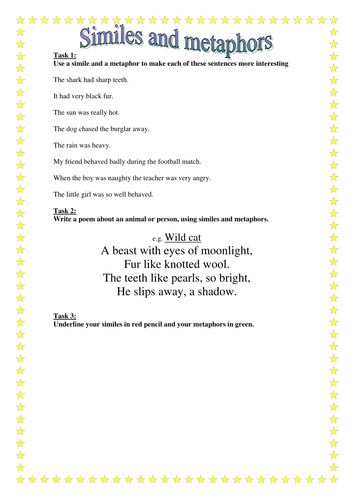 Similes and Metaphors interactive worksheet Similes and Metaphors online activity for 3 to 5. You can do the exercises online or download the worksheet as pdf.