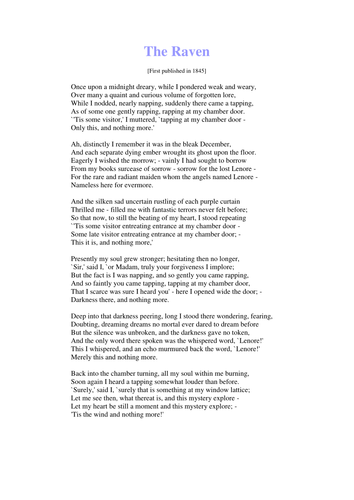 PDF Teaching Edgar Allan Poe s - America in Class "The Raven" is "one of these 'dainties bred in a book' which we feed on. It will stick to the memory of everybody who reads it. (Editor's note accompanying first publication of "The Raven" in the Evening Mirror, January 29, 1845) "Edgar A. Poe…gives a wild and shivery poem, which he calls the Raven. It is