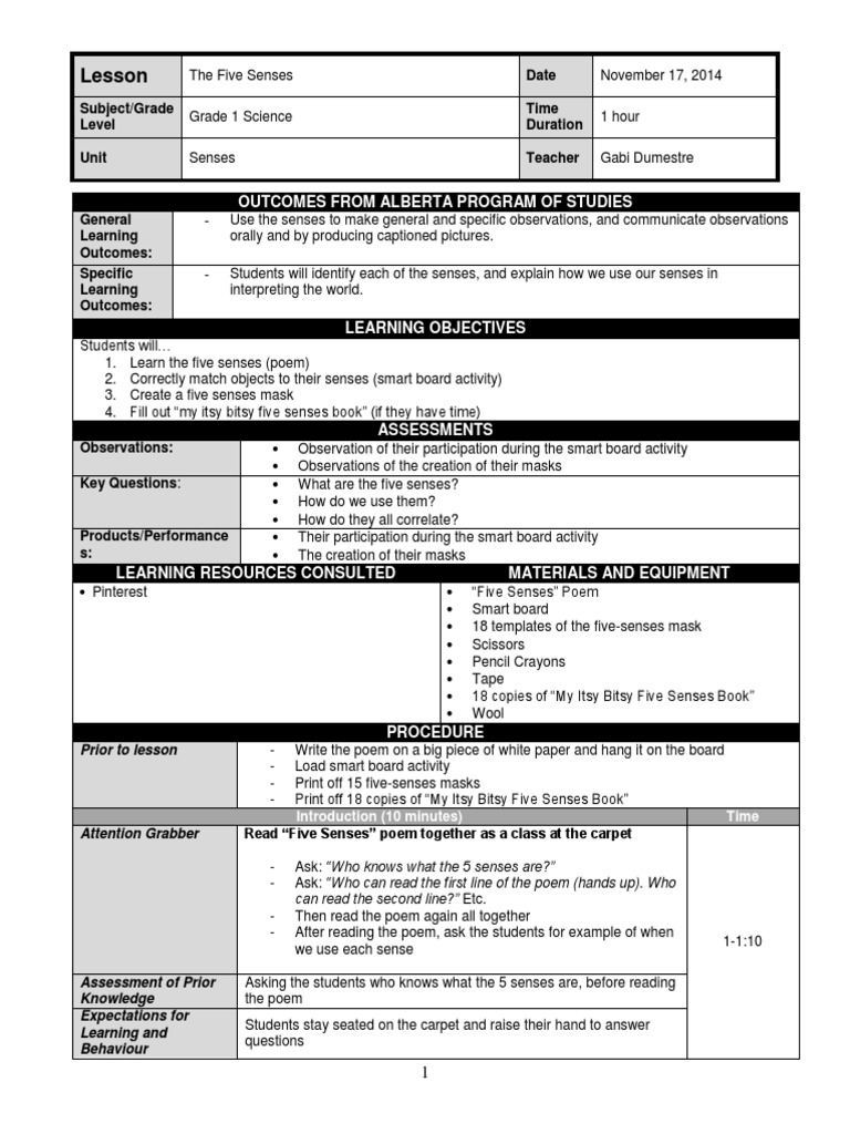 My Five Senses | Lesson Plan | Education.com RI.K.1 SL.K.1.a Learning Objectives Students will be able to identify and describe the five senses. Introduction (10 minutes) Tell the students you are going to talk about their five senses. Ask students to give you a thumbs up if they can name the five senses. Review the senses and what they do, then play the Five Senses video.