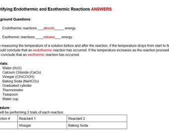 Exothermic and Endothermic Reactions - Middle School Science Unit ... Exothermic and Endothermic reactions are fun and engaging for students. ... two lab activities, a STEM engineering activity, a reading passage, response pages, a quiz, and answer keys for everything! The materials for the labs include thermometers, hand warmers, glass jars, vinegar, baking soda, calcium chloride, ammonium chloride, and water. ...