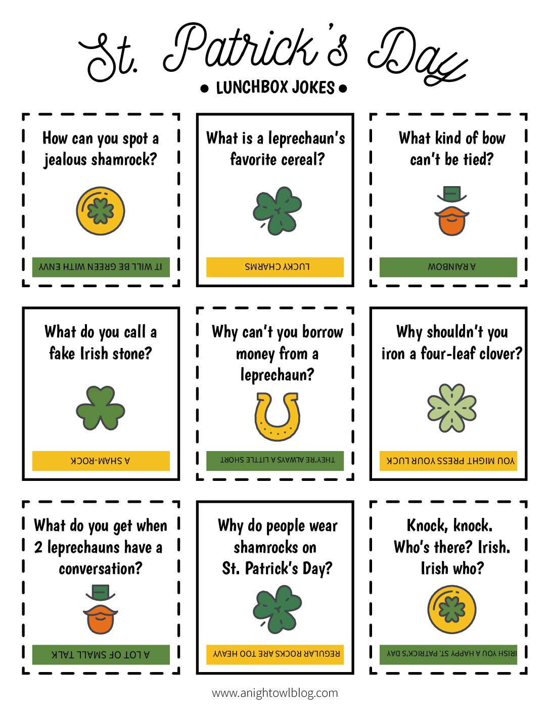 42 St. Patrick's Day Jokes and Puns for Kids - Parents St. Patrick's Day 2021 will be socially distanced—but not even COVID-19 can keep kids from laughing at a perfectly punny St. Paddy's joke. Channel "the luck of the Irish" from the comfort of ...