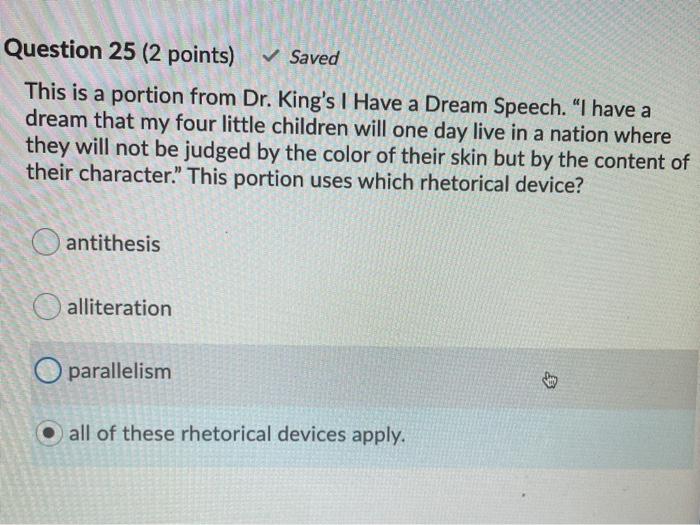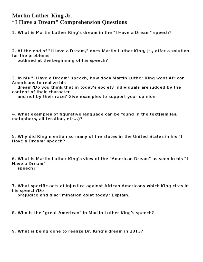 Alliteration in i have a dream speech. Martin Luther King - I Have A Dream Speech - August 28, 1963 I Have a Dream SpeechMartin Luther King's Address at March on WashingtonAugust 28, 1963. Washington, D.C.When we let freedom ring, when we let it ring from e... 'I have a dream' speech - Poem Analysis Alliteration: the use of the same consonant sounds at the beginning of words. For example, King uses “trials and tribulations,” “dark and desolate,” “sweltering summer,” and “marvelous new militancy.” Famous Quotes from the I have a dream speech. Below, readers can find a few of the most famous quotes from this speech. Analysis of Martin Luther King’s I Have a Dream Speech Jan 18, 2011 · The “I have a dream” speech by Martin Luther King is recognised as one of the best speeches ever given. Here Stevie Edwards looks at what makes it so memorable. ... As well as rhythm and frequent repetition, alliteration is a hallmark device, used to bang home key points. The format is simple – always an aid to memorability! It falls into ... 100 Literary Devices and Figures of Speech - Academia.edu George Orwell, Animal Farm 3. alliteration. A number of words, having the same first consonant sound, occur close together in a series. ... Martin Luther King, Jr., I have a dream speech 30. dactyl. A long syllable followed by two short syllables Half a league, half a league, Half a league onward, All in the valley of Death Rode the six hundred ...