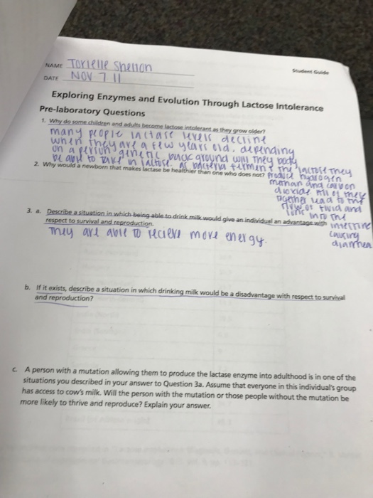 PDF Lactase Enzyme lab - Waterford Mott Biology Lactase Enzyme Lab Teachers Answer Sheet Teachers will be able to assess the results table (the only positive reaction should be test tube A) and the teacher will be able to correct the conclusion questions. Answer Key 1. the students should draw a hydrolysis-induced fit model 2. Lactase Enzyme Lab - 810 Words | Studymode Questions 15 points/ _____ Lactase enzyme lab OBJECTIVES: 1. Understand how biological molecules are essential to the survival of living organisms * * 2. Compare the structures and functions of the major biological molecules (carbohydrates, proteins, lipids, and nucleic acids) as related to the survival of organisms. * 3. Substrate Specificity of the Enzyme Lactase - Lab Manual for Biology 2e ... Discuss the answer to question 1 with the class. Activity 3: Substrate Specificity of the Enzyme Lactase An enzyme's active site contains side chains of the amino acids that can only bind to certain molecules. For example, if the active site is largely positively charged, then negatively charged substrates will be attracted. Lactase Enzyme Introductory Bio II Lab - StuDocu Draw three models of how the structure of an enzyme relates to how well the function catalyzes chemical reactions. Model 1 should be a fully functioning enzyme. Model 2 should be a poorly functioning enzyme. Model 3 should be a non-functional enzyme. Simulation Option 1: Temperature Start with the initial glucose at 48 mM and the pH at 7.