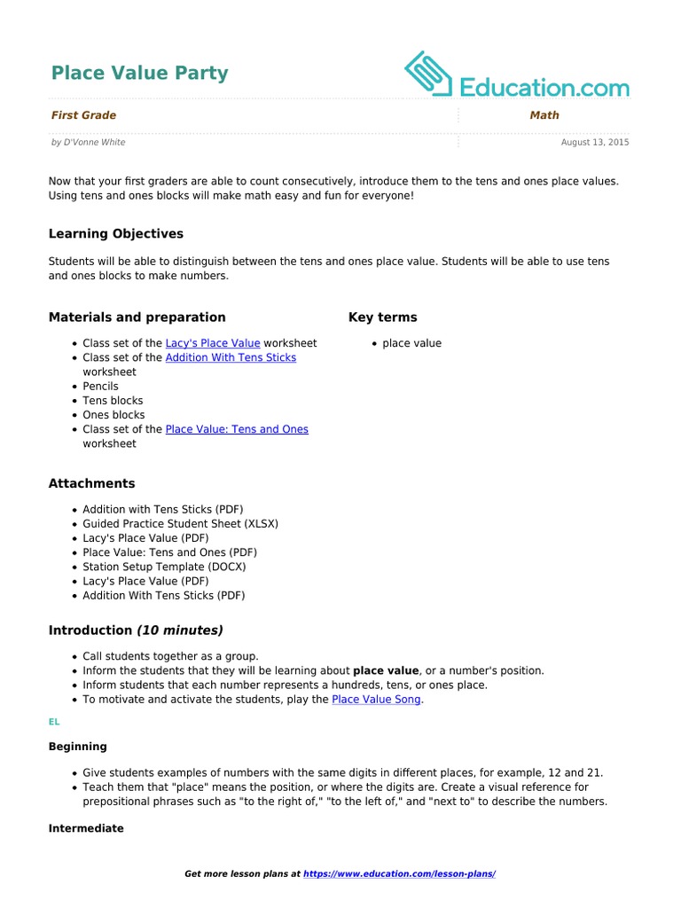 Place value lesson plans 1st grade. 3-Digit Place Value Machine - Math Game | Game - Education Great for second grade math students, kids will practice identifying three-digit numbers and creating visual representations by loading blocks of hundreds, tens, and ones to match the number displayed. This machine-themed math game is a creative way for kids to hone their skills around place value and three-digit numbers. 5th Grade Mathematics | Place Value with Decimals | Free ... In Grade 4, students developed the understanding that a digit in any place represents ten times as much as it represents in the place to its right (4.NBT.1). With this deepened understanding of the place value system, students read and wrote multi-digit whole numbers in various forms, compared them, and rounded them (4.NBT.2—3). Classroom Resources - National Council of Teachers of Mathematics These stories and lesson sketches, focused in the middle and high school grades, are meant to help your students extend their view of the world a little bit by using math to make sense of experiences in daily life. Kindergarten Lesson Plans – Kids Printable Worksheet – JumpStart Online Kindergarten Lesson Plans. It is in kindergarten that 4 – 6 year olds are first introduced to many concepts.Online kindergarten lesson plans are a good resource for teachers and homeschooling parents who are looking to introduce the right amount of fun and learning in their lessons.