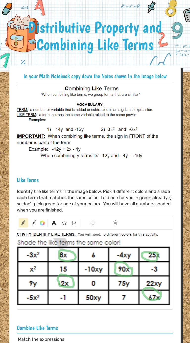 Combining Like Terms With Distributive Property Worksheet Worksheets are classwork, distributive property and combining like terms, homework, combine like terms and distribute property, 7th grade math, combining like terms, simplify expressions. This Combining Like Terms Common Core Math Color By Number Includes 10 Questions In Which Students Will Simplify A Rational Expression Using The Distributive ...