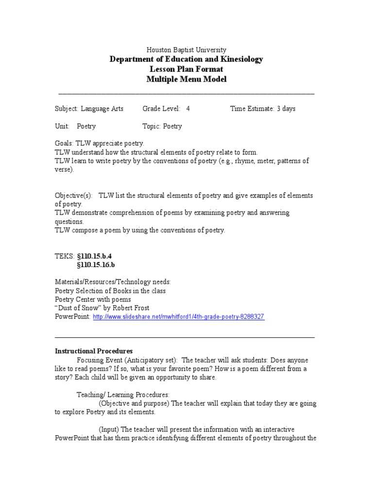 4th Grade Poems to Delight Students in Every Classroom - We Are Teachers With options for different reading levels, you'll find something for every student! 1. How to Write a Very Long Poem by Kenn Nesbitt. "…you should try this little writing trick.". 2. Dream Variations by Langston Hughes. "To fling my arms wide in some place of the sun…". 3. Be Glad Your Nose Is on Your Face by Jack Prelutsky. 4th grade poetry - SlideShare The-Great-Resignation-PPT.pdf ssuser1415bc. 0 views ... ChrisMartin260004. 0 views • 4 slides. 4th grade poetry 1. Poetry A poem is created by putting words together in an interesting way to express a feeling, create a mental picture, tell a story, or make a sound. Poetry entertains the ears and the eyes. 2. 4th grade poetry - [PPT Powerpoint] - vdocuments.net 4th grade poetry; of 22 /22. Match case Limit results 1 per page. Poetry Poetry A poem is created by putting words together in an interesting way to express a feeling, create a mental picture, tell a story, or make a sound. Poetry entertains the ears and the eyes. Post on 16-May-2015. 24.969 views. Category: Education. 2 download. Introduction to Poetry [4th grade] - Trinity University 4th Grade UNDERSTANDING BY DESIGN Unit Cover Page Unit Title: Introduction to Poetry Grade Level: 4th Subject/Topic Area(s): ELA, Poetry Designed By: Eloisa Flores Time Frame: 14 days School District: East Central ISD School: Salado Intermediate School Address and Phone: 3602 South WW White Road San Antonio, TX 78222 (210) 648-3310
