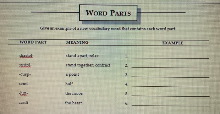 Meaning of word parts. Using Word Parts to Determine the Meaning of Words Write the following word on the board: ANTIDISESTABLISHMENTARIANISM. Ask students if they recognize any word or word parts. Have them share the word parts that they see, and as they share, underline or circle those word parts. Example: Anti-dis-establish-ment-arian-ism. Have students practice saying the word on the board, just for fun. Appendix A: Word Parts and What They Mean - MedlinePlus Here is a list of word parts. They may be at the beginning, in the middle, or at the end of a medical word. General Words; Body Parts and Disorders; Positions and Directions; Numbers and Amounts; Colors; Physical Properties and Shapes; Good and Bad; Procedures, Diagnosis and Surgery; General Words PART | English meaning - Cambridge Dictionary part definition: 1. some but not all of a thing: 2. partly, or to some degree: 3. to an important degree: . Learn more. Medical Terminology QUIZ #1 Flashcards | Quizlet In the term intra/ven/ous, which part is the word root? Ven. In the term hepatitis, hepat is the: Word root. In the term oste/o/arthr/o/pathy, a combining form is: Oste/o. A combining vowel may be used: Between two word roots or a word root and a suffix. The basic unit of all living things is the: