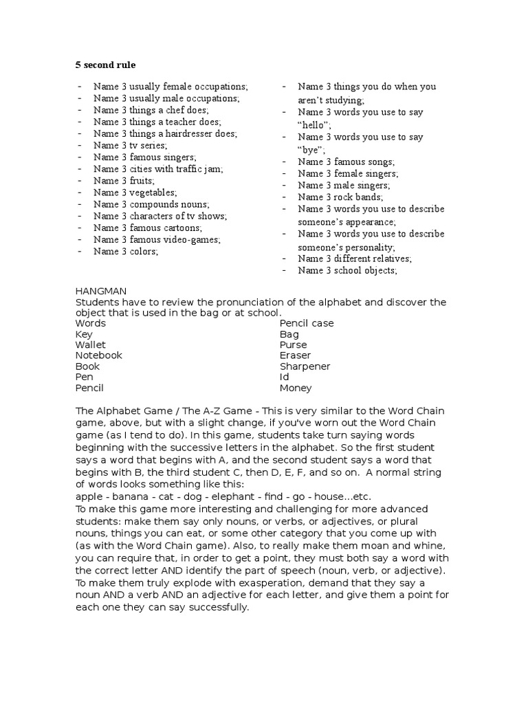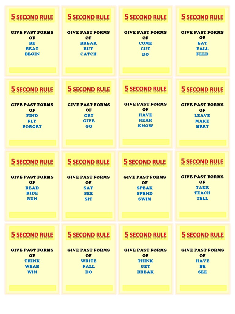 schoolholidaysaustralia.com.au › 50-common-550+ common 5 Second Rule game questions Jan 26, 2022 · Here are some common 5 Second Rule game questions: Name 3 months of the year Name 3 pizza toppings Name 3 places to shop Name 3 things that can fit under the bed Name 3 things you spread on toast Name 3 animals you would like as pets Name 3 reasons to use a mirror Name 3 things that live in dirt ... Think Fast & Play the 5 Second Rule Board Game