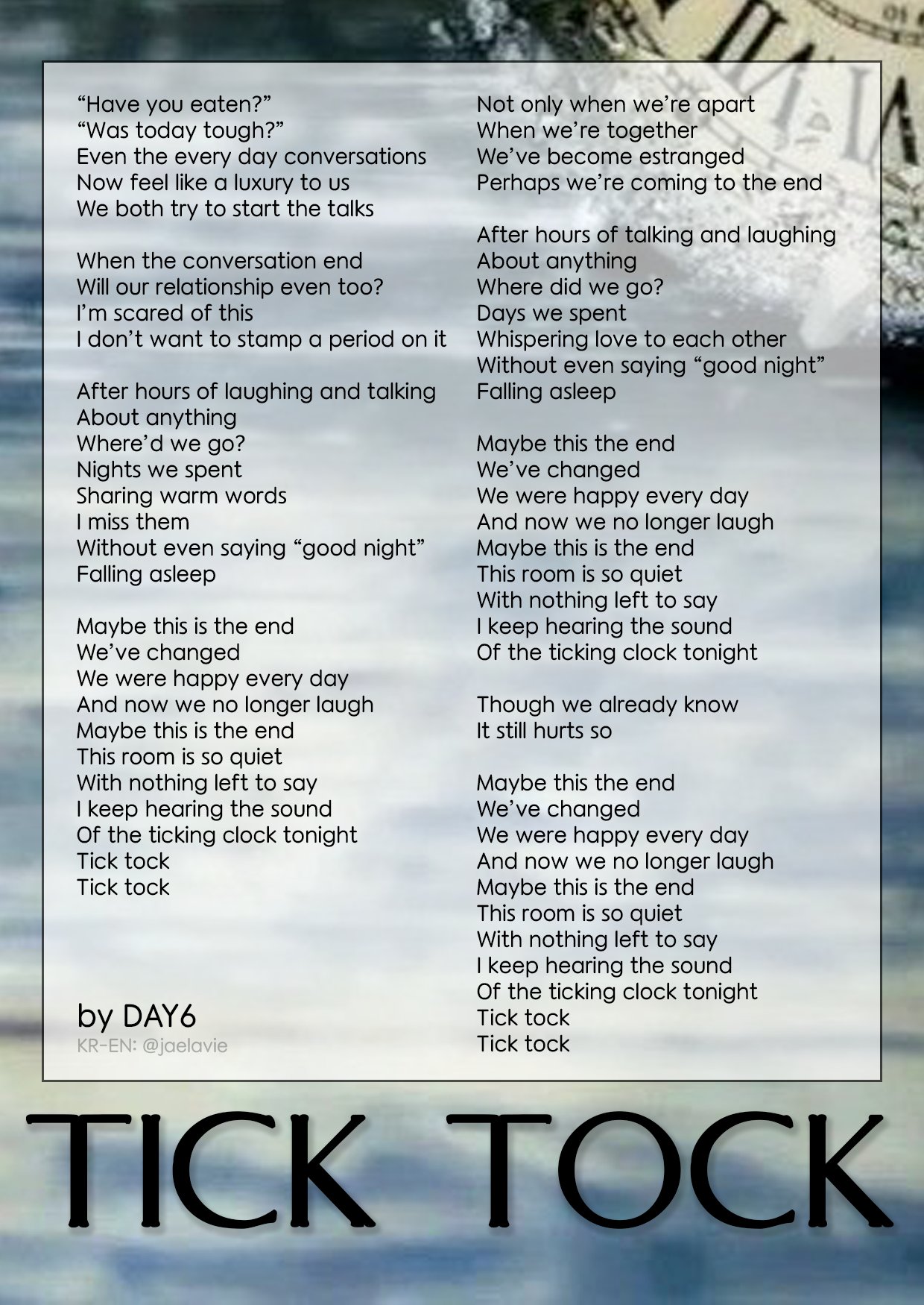 Tick Tock on the Clock - song and lyrics by Lilly Oxford | ... Tick Tock on the Clock - song and lyrics by Lilly Oxford | Spotify Home Search Your Library Create Playlist Privacy Center Cookies Preview of Spotify Sign up to get unlimited songs and podcasts with occasional ads. No credit card needed. Sign up free 0:00 0:00 Company About Jobs For the Record Communities AAAthetaken – Tick tock On the clock Lyrics | Genius Lyrics [Chorus] Tick Tock On the clock Please just make it stop I’ll put up a fight Just to get my mind right Tick Tock On the clock Please just make it stop I’ll put up a fight Fuck I think I said ... Kesha – TiK ToK Lyrics | Genius Lyrics Aug 7, 2009 · Tick tock on the clock, but the party don't stop, no Oh, woah, woah, oh, oh, woah, woah, oh Don't stop, make it pop, DJ, blow my speakers up Tonight, I'ma fight 'til we see the sunlight...