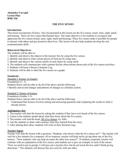 All About Our Senses Lesson Plan | Teacher.org Each day we use all five sense: sight, smell, taste, hearing, and touch to explore the world. Ask students to identify how each sense is experienced. Sight = eyes, Smell = nose, Taste = tongue (mouth), Hearing = ears, Touch = hands (feet) Body of Lesson My Five Senses Preschool Activities, Lessons, and Printables My Five Senses activities, crafts, lessons, games, and printables for preschool and kindergarten. Our five senses allow us to enjoy the world around us -- the taste of our food, the sound of music, the beauty of a sunrise, the softness of a cat's fur, and the fragrance of a rose. Children may recognize the importance of their senses, but they ... The Five Senses Lesson Plan - SlideShare The Five Senses Lesson Plan 2. Analyze the learner: Kindergarten classroom 14 white, 3 African American, 2 Asian, and 1 Hispanic 11 boys and 9 girls 3. Main Objective: The students will demonstrate their knowledge of the senses by labeling which body part belongs to each sense and provide a short example of what each sense allows them to do. ...