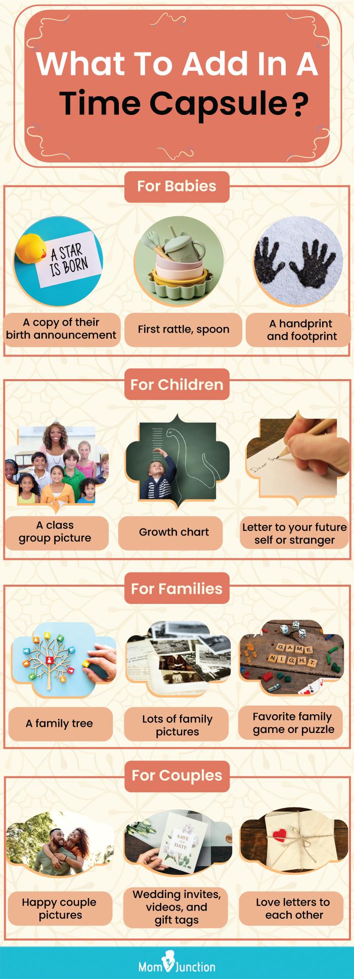 32 Best Time Capsule Ideas for Baby: A Keepsake That Lasts a... Apr 20, 2022 · To make a baby time capsule, you’ll need the following items: A container that will keep your baby’s keepsakes safe from pests, bugs, and sunlight (exposure to sunlight causes yellowing of white items). Keepsakes from the baby’s first year such as ultrasound photos, hospital records, and milestone photos. For a more complete list, see below. How to Write a Time Capsule Letter + Examples | Cake Blog Jan 15, 2021 · Check our examples of time capsule letters for loved ones: 1. To My Dearest Love, Tomorrow I get to marry you. I know I should be sleeping, but I’m just too excited. I look so... 2. Dear future grandchildren, 14 Best Time Capsule Ideas For Kids And Parents - Find your mom... Feb 1, 2021 · 14 Time Capsule Ideas 1. Photographs. Every great time capsule includes photographs to take you down the memory lane of when your kiddo was... 2. Handprints and footprints. No matter how old your kids are, making handprints and/or footprints is an easy and fun... 3. Newspaper clippings. Although ...