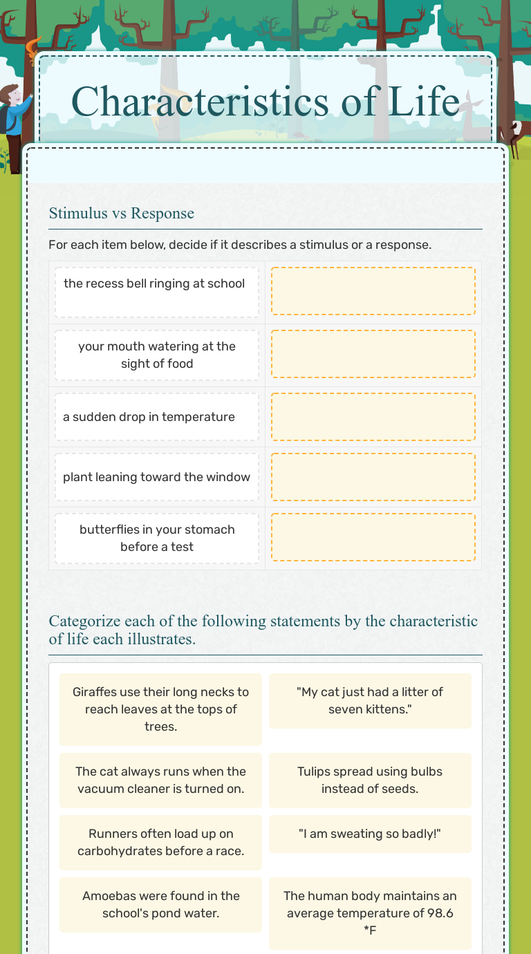 Characteristics of Life ( Read ) | Biology | CK-12 Foundation Characteristics of Life. Describes characteristics shared by all living organisms. All organisms must be composed of cells, metabolize, reproduce, and respond to their environment. The Characteristics Of Life Teaching Resources | TpT - TeachersPayTeachers This 3 page EDITABLE POWERPOINT WORKSHEET with ANSWER KEY provides diagrams, questions, clues, prompts and fill in the blanks that allow students to follow along with the Characteristics of Life PowerPoint. An excellent way to keep students engaged and participating during the PowerPoint presentation. Characteristics of life worksheet ID: 1173036 Language: English School subject: Science Grade/level: Grade 7 Age: 10-13 Main content: Characteristics of life Other contents: organisms Add to my workbooks (25) Download file pdf Embed in my website or blog Add to Google Classroom DOC Classification of Living Things Worksheet - Anderson School District Five Classification of Living Things Worksheet. Part A. List the characteristics of living things. 1. obtain and use resources. 2. reproduce. 3. grow and develop. 4. respond to stimulus. Part B. On the blanks to the left of each statement, write the life characteristic referred to in the statement. respond to a stimulus_ An earthworm turns away from ...