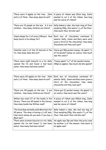 Add & Subtract Fractions Word Problems | K5 Learning Mixed numbers word problems. These word problems require simple addition and subtraction of fractions and mixed numbers. Only fractions with like denominators are considered. Worksheet #1 Worksheet #2 Worksheet #3 Worksheet #4. Worksheet #5 Worksheet #6. Add & subtract fractions word problems | K5 Learning Below are our grade 5 math word problem worksheet on adding and subtracting fractions. The problems include both like and unlike denominators, and may include more than two terms. Worksheet #1 Worksheet #2 Worksheet #3 Worksheet #4 Worksheet #5 Worksheet #6 Similar: Add / subtract mixed numbers word problems Division by unit fractions word problems Adding and Subtracting Fraction Word Problems - TES Adding and Subtracting Fraction Word Problems Subject: Mathematics Age range: 7-11 Resource type: Worksheet/Activity 109 reviews File previews docx, 18.11 KB Here are some word-based questions for solving problems involving the addition and subtraction of fractions. Feedback greatly appreciated! Creative Commons "Sharealike"