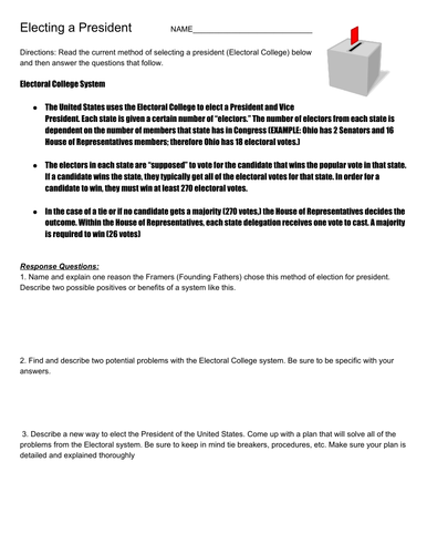 Electoral College Worksheet Readingwith Questionsand Answer Key-1 ... Electoral College Worksheet Readingwith Questionsand Answer Key-1-converted Answer key School J. M. Hanks High School Course Science (BLAW @021) Academic year 2021/2022 Helpful? 2 1 Comments Please sign in or register The Electoral College questions and answers - Gonzaga University How is the Electoral College designed to work? Each state has as many "electors" in the Electoral College as it has representatives and senators in the U.S. Congress. When citizens vote for the presidential election, they are telling their states' electors how to cast their ballots. Electoral College Worksheet Teaching Resources | TPT Electoral College Worksheet Bundle with Answer Keys Created by Social Studies Sheets Electoral College Worksheet Bundle with Answer Keys Subjects: Government, Social Studies - History, U.S. History Grades: 5 th - 12 th, Adult Education Types: Worksheets, Handouts, Printables Show 5 included products $11.25 $10.13 Bundle 5.0 (2) Add to cart